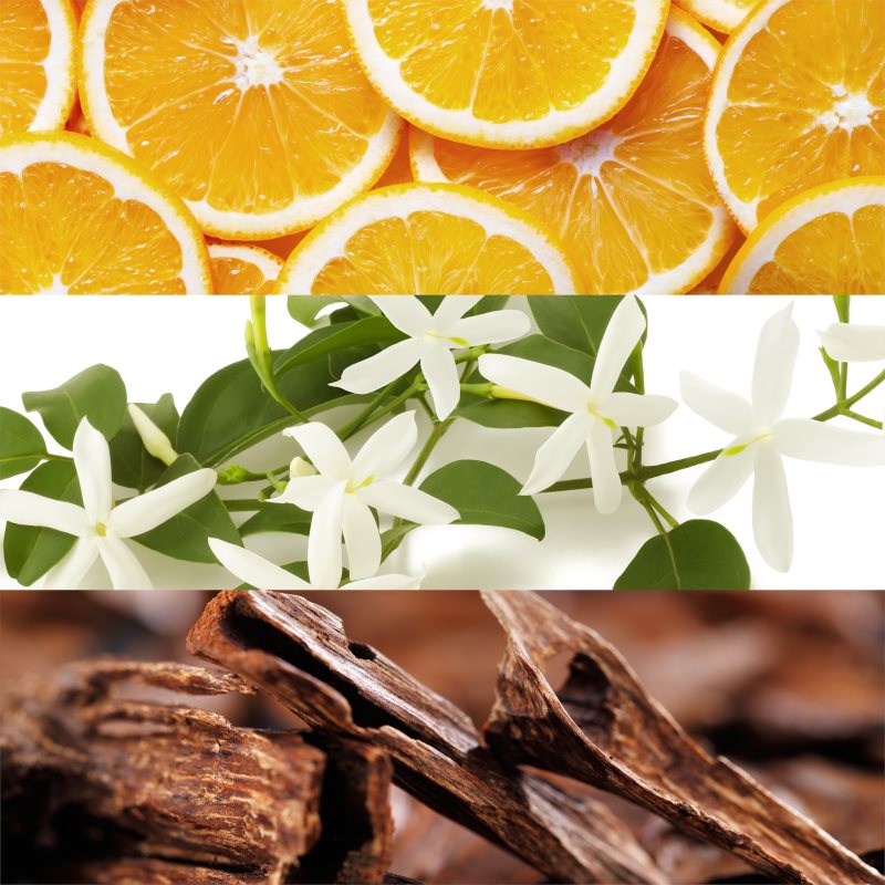 Debutează cu portocale dulci, cardamon picant și coriandru. Acestea lasă locul tonurilor florale de iasomie și de violete, care tranziționează, la final, spre acordurile dulci și picante de lemn de santal, de mosc și de vanilie exotică.