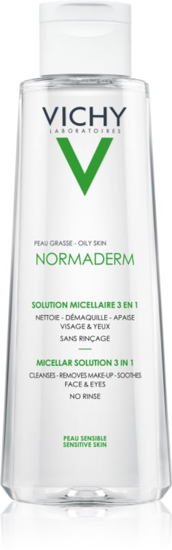 Căutați un produs care să demachieze perfect, să curețe și, totodată, să calmeze pielea? Apa micelară Vichy Normaderm îndepărtează rapid și perfect machiajul, iar compoziția blândă, fără alcool, vă permite să o utilizați fără probleme și pentru demachierea ochilor. În plus, eliberează fața de toate impuritățile și de excesul de sebum. Datorită efectelor calmante și hidratante, lasă tenul fin și proaspăt.